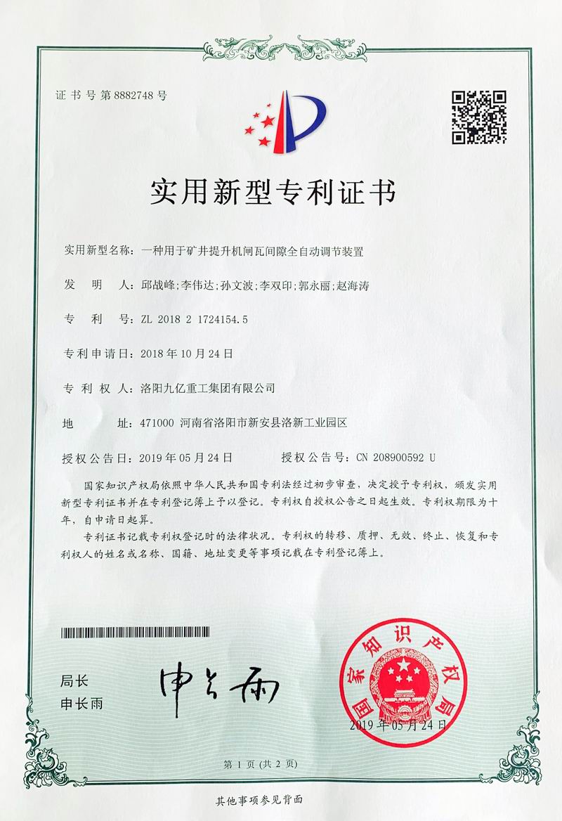 閘瓦間隙全自動(dòng)調(diào)節(jié)裝置證書